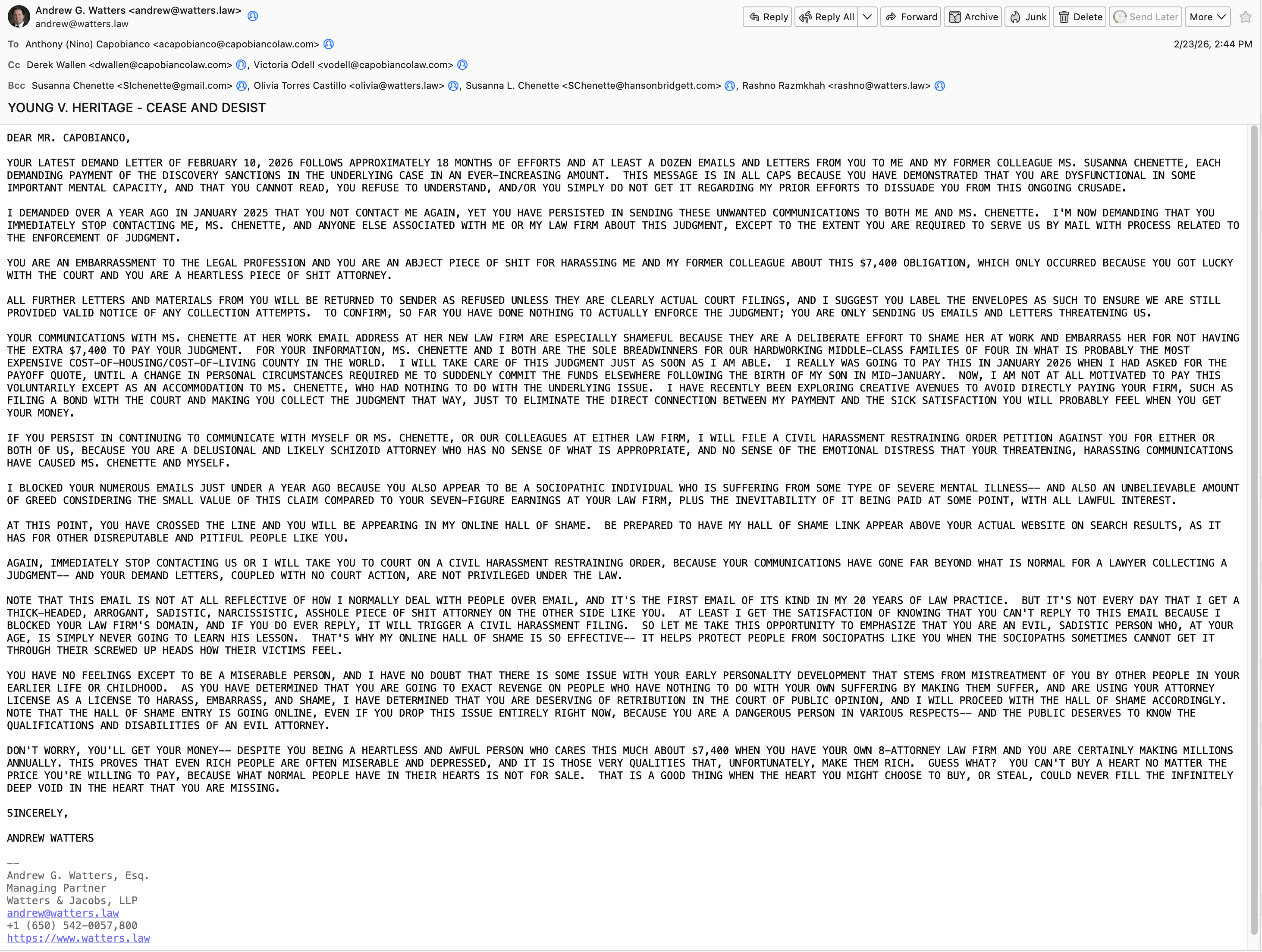 Sat, 28 Feb 2026 07:17:12 -0800 Andy from private IP, post #13149974 /all I wrote my first-ever polemic to an asshole attorney People who know me know this is very unusual. In fact, this is the first time in 20 years I've written this type of email. Basically, this guy won $5k in discovery sanctions in a case and I ended up dismissing the case. He has harassed me for 18 months about this measly judgment that he has, and he also harassed my former colleague Susanna regarding the same thing. I couldn't take it anymore, which is why I wrote the polemic. I've had a chance to cool off and...I think it's my greatest ever takedown of any attorney, plus one of the best emails I've ever written. Enjoy! #LawFirm Sat, 28 Feb 2026 15:21:50 -0800 marlon from private IP Reply #10080037 writing in all caps is considered to be the same as yelling Sat, 28 Feb 2026 15:27:58 -0800 Andy from private IP Reply #15517596 I was yelling. Lol. Sat, 28 Feb 2026 16:17:19 -0800 zerosugar from private IP Reply #10058489 🤣 You did good. There are lots of jerks in law who have zero respect for others. They could settle things peacefully, but they want to be hard asses and cause others unnecessary stress. lol at his surname Capobianco. I know of a guy with that name, but think no relation. Hahaha oh wow I looked this lawyer up. He is completely bald. Shiny too. His surname means “head white.” Mediterranean baldness truly suck. I can’t even guess his age, but he likely lost it all early. Some people also maintain the weirdest professional identities. It’s like they have no personalities outside of work. Sat, 28 Feb 2026 16:18:50 -0800 zerosugar from private IP Reply #14720075 👍 Its necessary to start telling people off. You may have done him a favor in the long run because nobody has probably ever had the nerve to call him out. Now he may change his behavior or think twice in the future. Sat, 28 Feb 2026 17:21:57 -0800 Andy from private IP Reply #10701251 https://www.andrewwatters.com/hall-of-shame/anthony-capobianco/ Sat, 28 Feb 2026 17:23:34 -0800 marlon from private IP Reply #10140197 A heartless, money-grubbing, and likely schizoid attorney. slander & libel, be careful bro Sat, 28 Feb 2026 17:31:04 -0800 Andy from private IP Reply #18485315 I made it clear those are my opinions, and I'm not worried at all. Opinion based on disclosed facts is privileged, thankfully. Sun, 01 Mar 2026 14:13:44 -0800 whiteguyinchina from private IP Reply #17815327 Wait you owe him money right?Replies require login.
